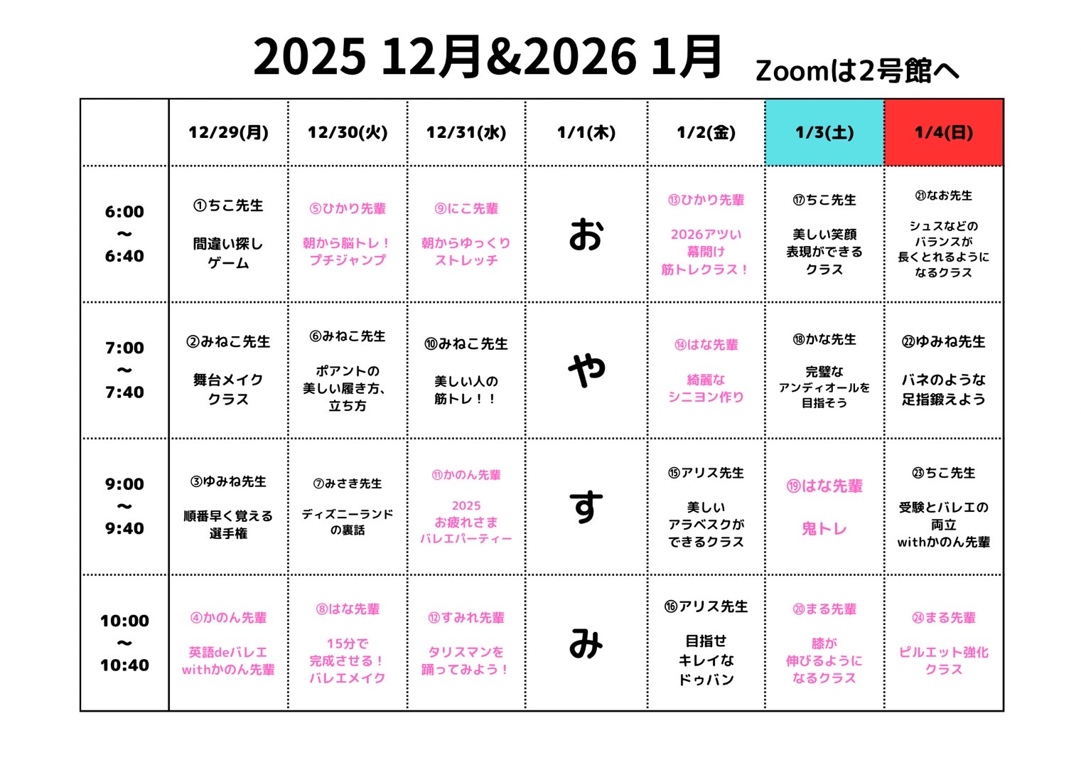 今年の冬のオンラインは1週間のみとなります。先生やETの工夫されたメニューが毎回楽しみです。新年気持ちを引き締めるのに絶好の機会ですね。このメニューを見て何か気がつきますか?わかった人にはお年玉🧧プレゼント!(参加者に限る)