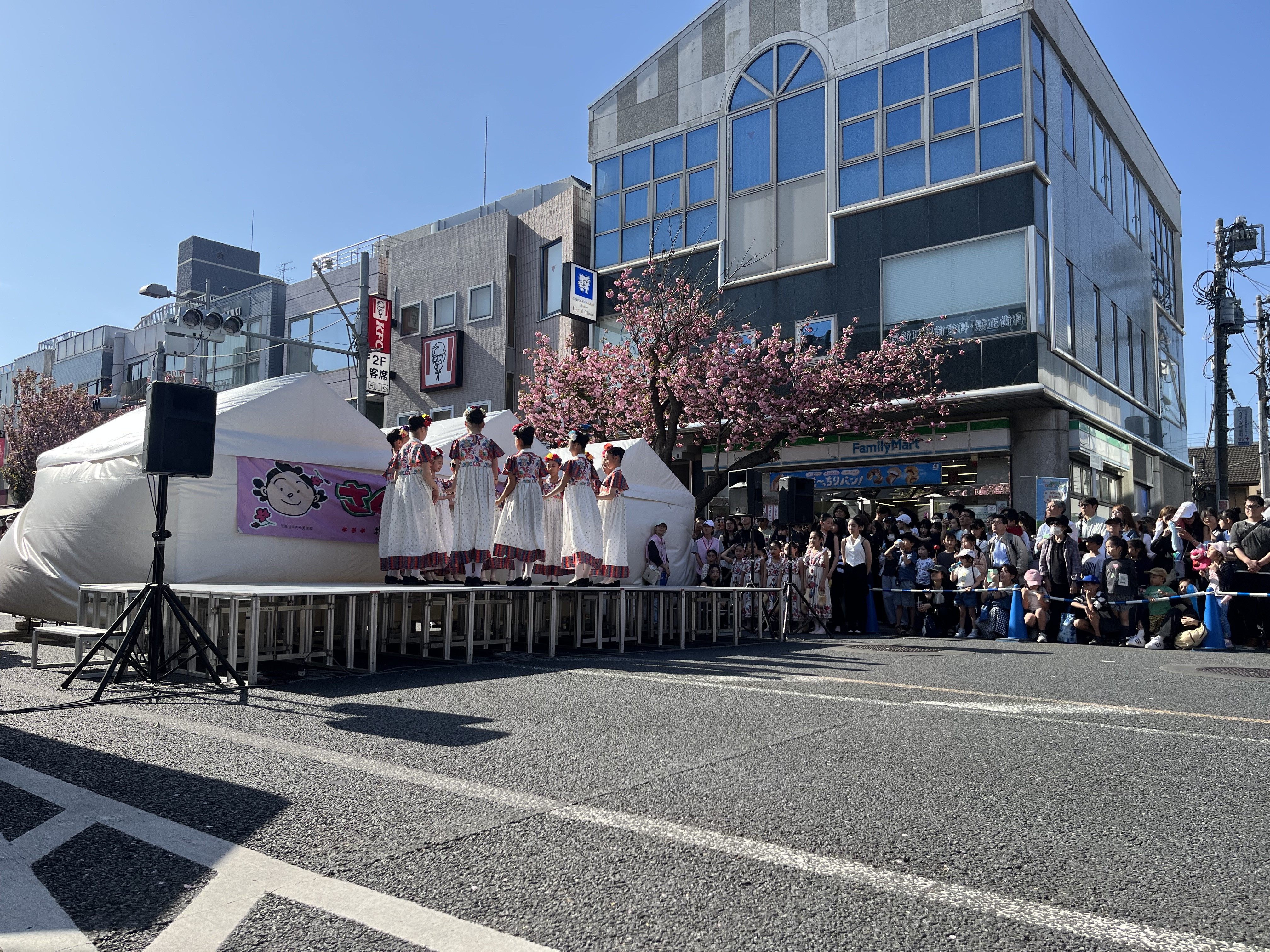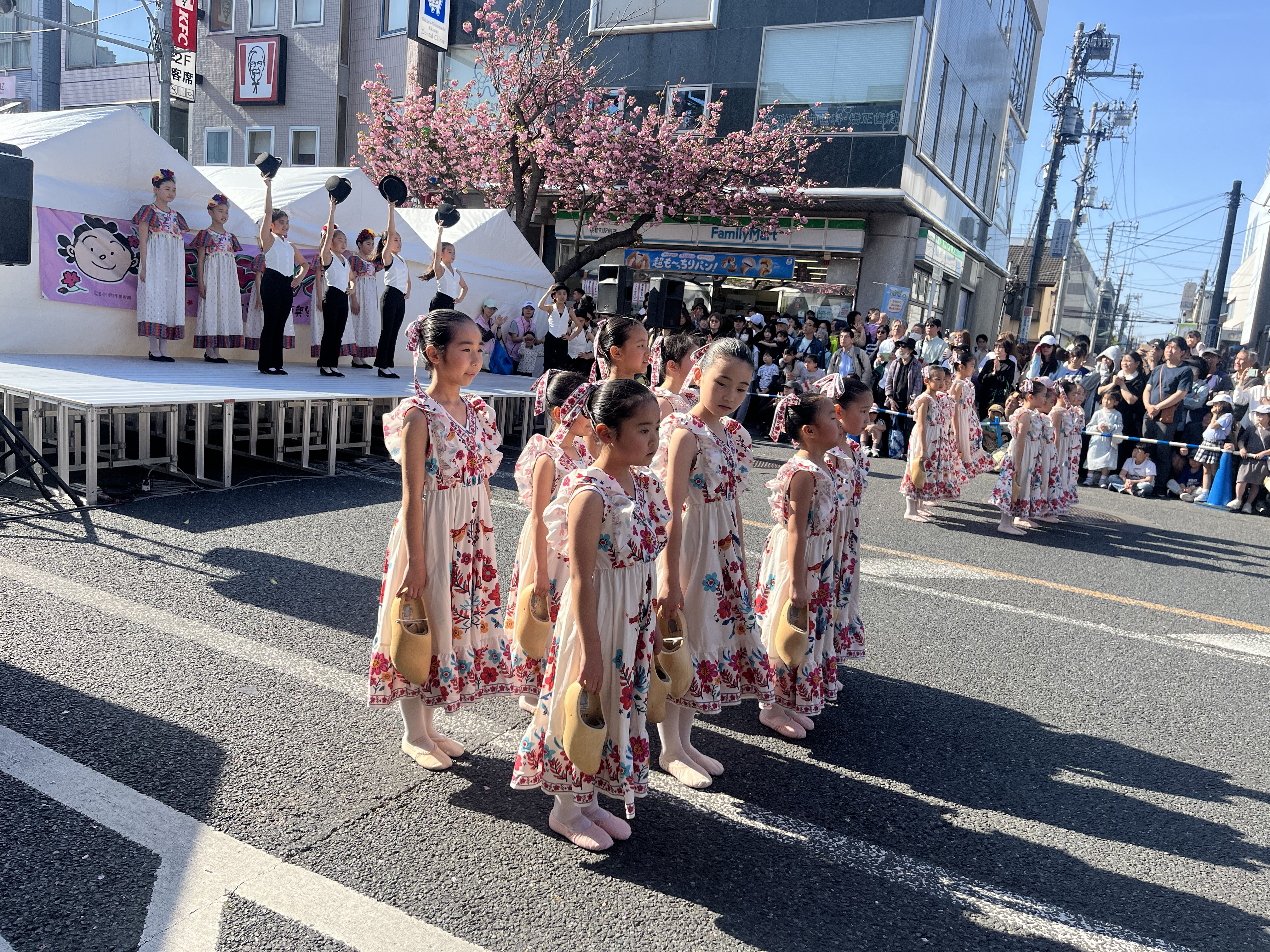 桜新町駅前の八重桜が満開になり、例年4月第二日曜日にあります桜祭りに出演させて頂きました!晴天に恵まれ、たくさんの人々が見に来てくださり、励ましと勇気をいただきました。ありがとうございました!今回は、木靴の踊り、メキシカンダンス、コーラスラインの3演目で踊らせていただきました!かわいい衣装にクールなハット🎩で街の八重桜と共に華やかなステージとなりました♪